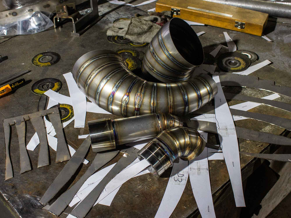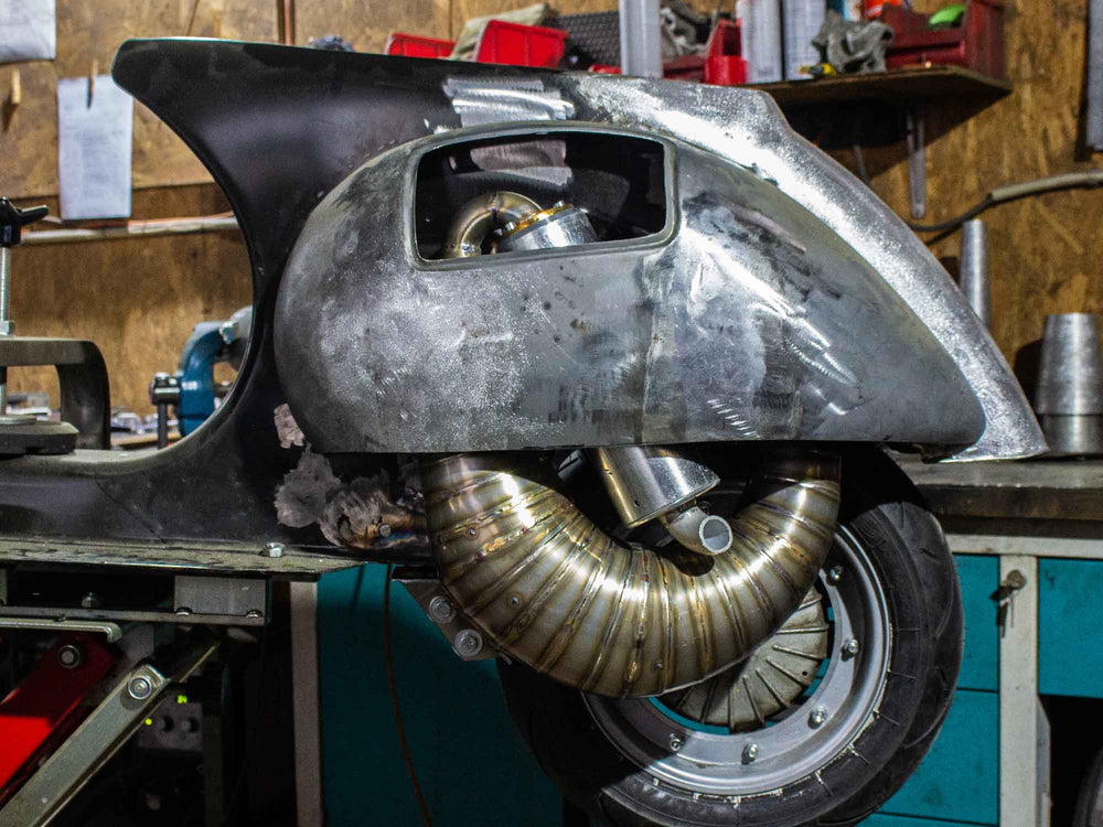 Eigens für den BFA 288ccm Motor von uns entwickelter Curley Auspuff, passend für unsere Superlow Series Largeframe Umbauten - handgefertigt aus 45 einzelnen Edelstahl-Segmenten und inklusive unserem hauseigenen Geräuschdämmungs-System.