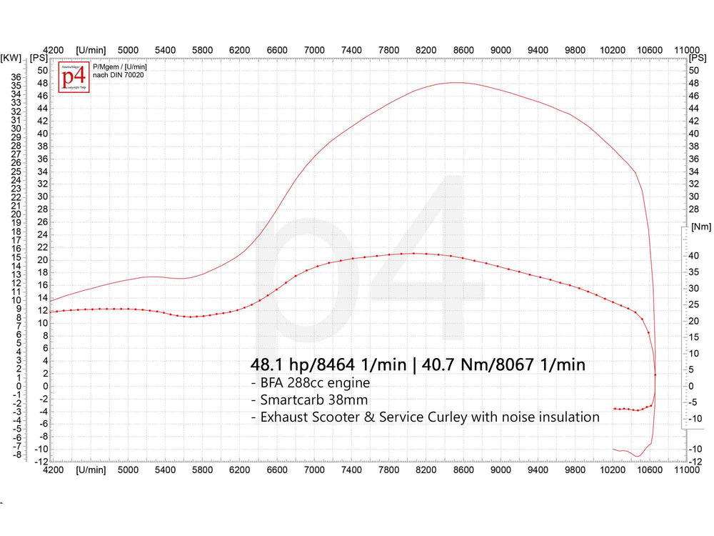Der Scooter & Service Curley Auspuff entwickelt auf dem BFA 288 Motor eine äußerst breitbandige Leistungskurve mit früh einsetzendem Drehmoment, was der Fahrbarkeit im Straßenbetrieb des PS-Boliden sehr entgegenkommt.