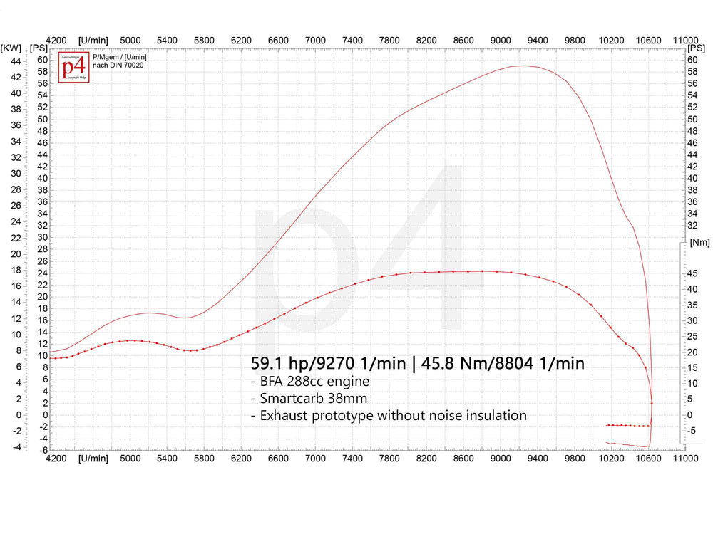 Mit einem 38mm Vergaser entwickelt diese Motorkonzept eine Spitzenleistung von knapp 50PS am Hinterrad.
