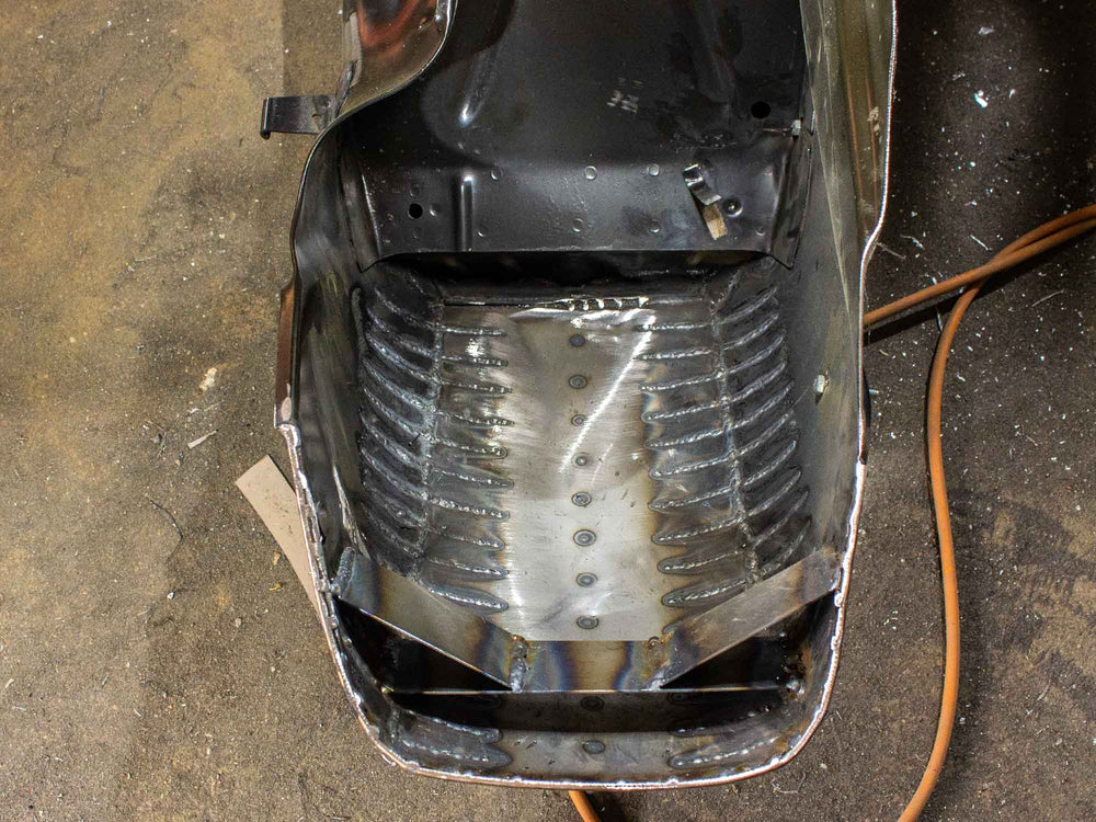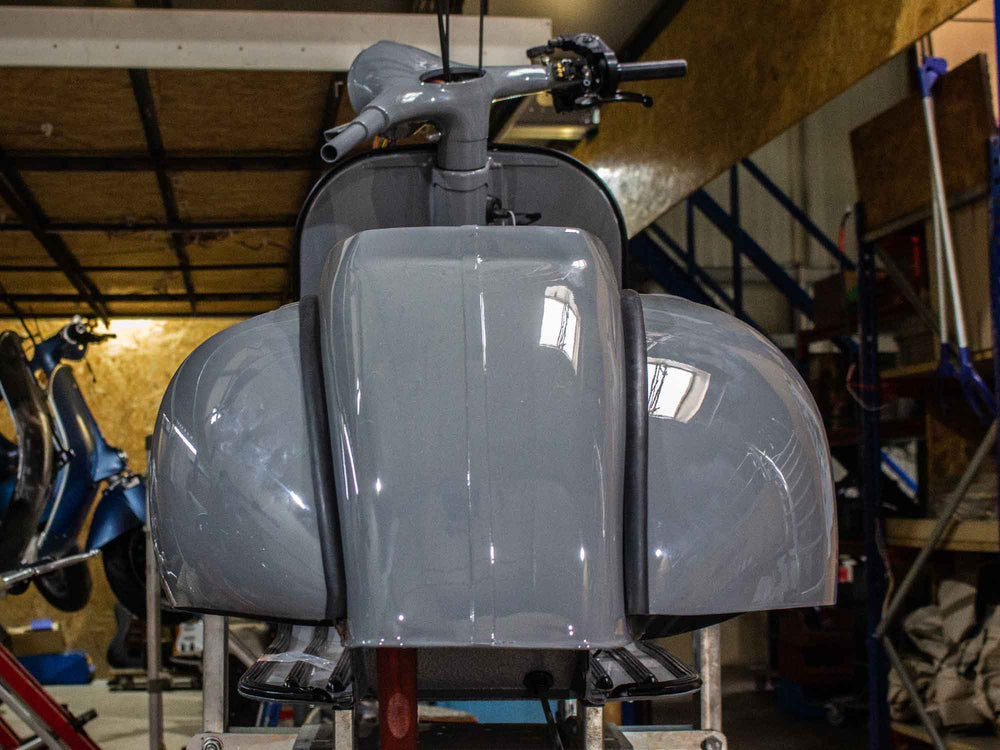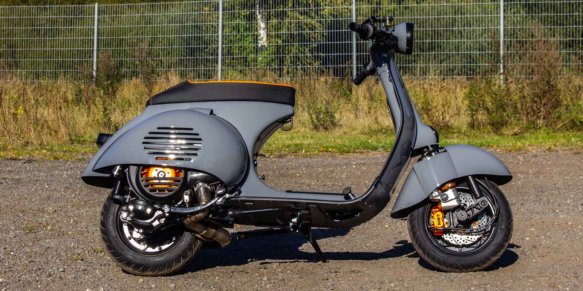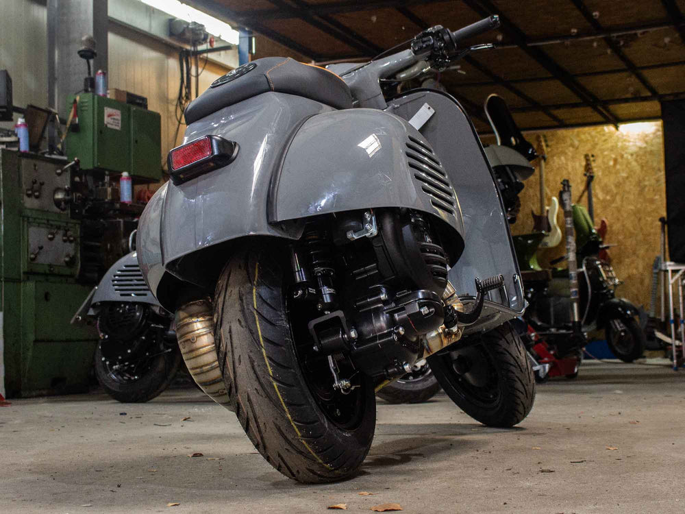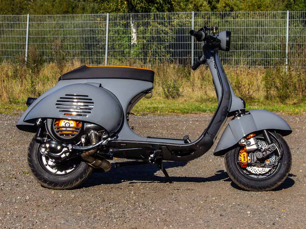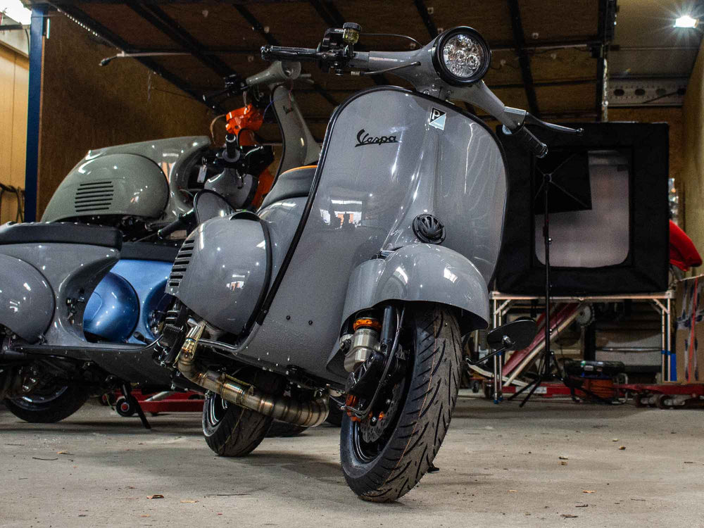 Vespa PX Umbau mit 244ccm Motor, Acma Seitenhauben, Sitzbanktank und Curley Auspuff System - Lackierung Audi Nardo Grau.
