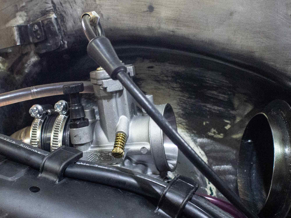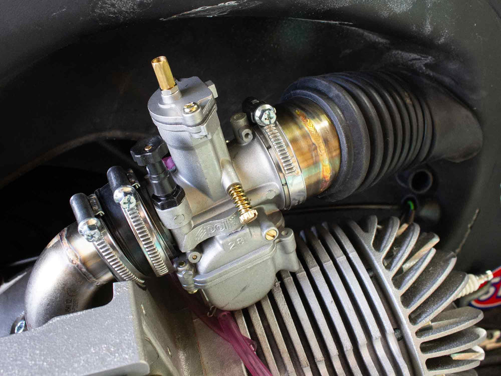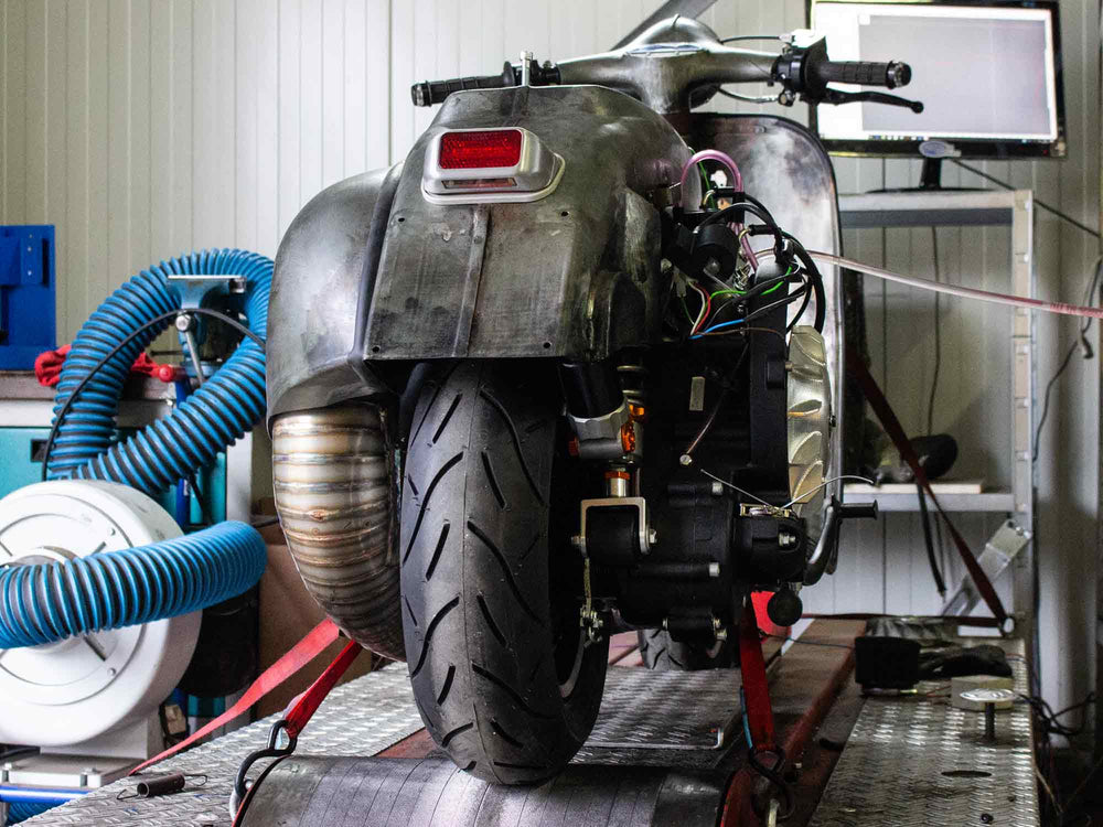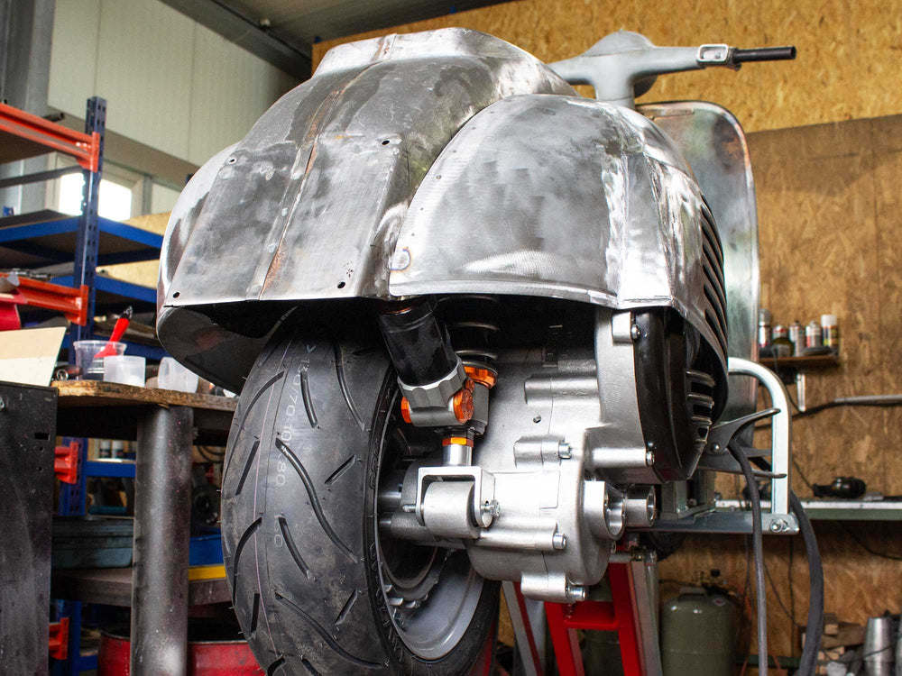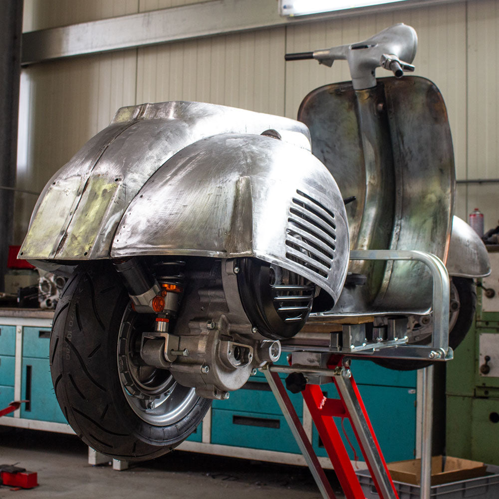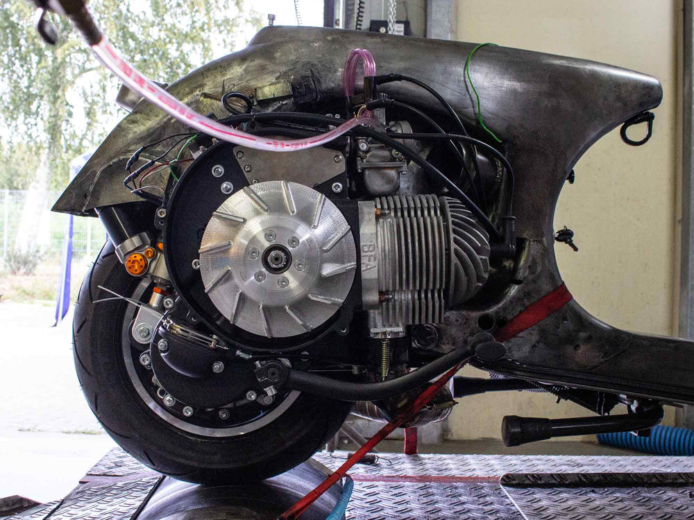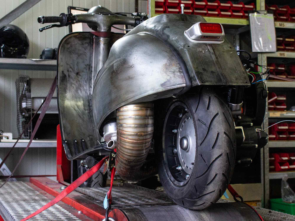 Der Rahmen wurde zusätzlich an entscheidenden Punkten verstärkt, um dem Potential des BFA Motori Motors mit 306ccm und einer zu erwartenden Leistung von über 45 PS gerecht zu werden - Projektziel ist für uns eindeutig eine bestmögliche Fahrbarkeit der Vespa im Straßen- und Alltagsbetrieb, sowohl in Bezug auf die Auslegung des Fahrwerks, als auch hinsichtlich der Leistungsentfaltung des 306ccm-Motorboliden.