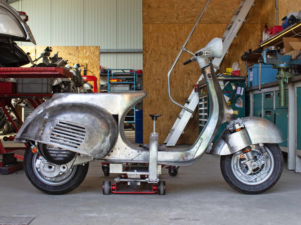 Nachdem die Front mit VNB-Beinschild und Superlow Gabel fertig gestellt ist, wird es im nächsten Schritt um die Einpassung des BFA 306ccm Motors und um die passende Umgestaltung des Hech-Bereichs gehen: Wir berichten hier natürlich regelmäßig von dem Fortschritt unserer Custom Vespa.