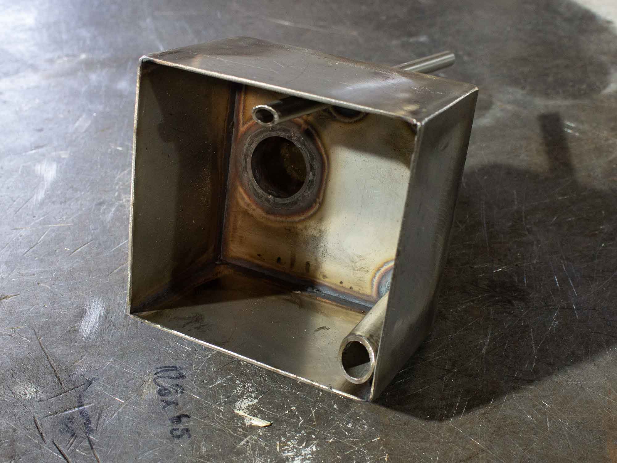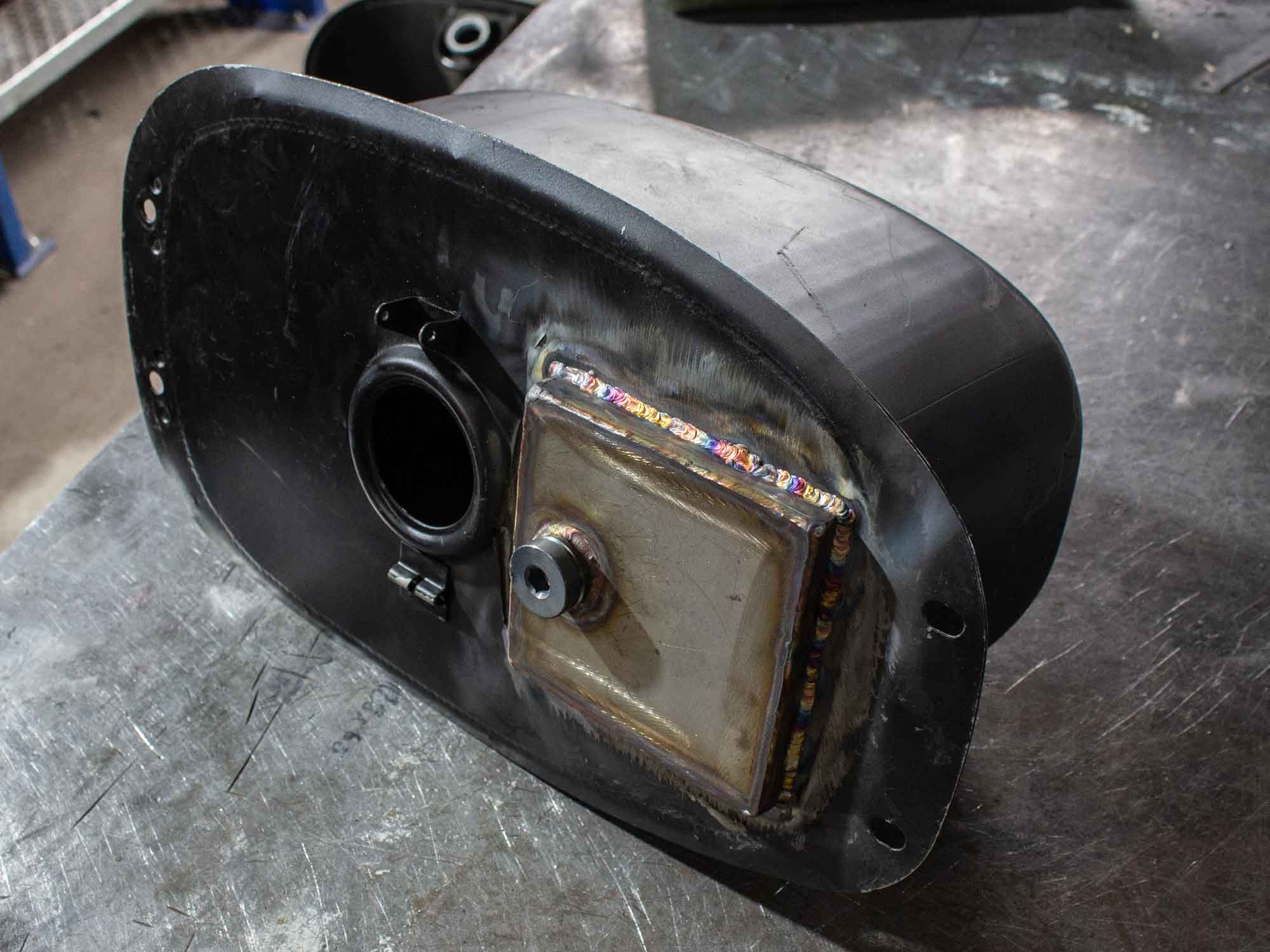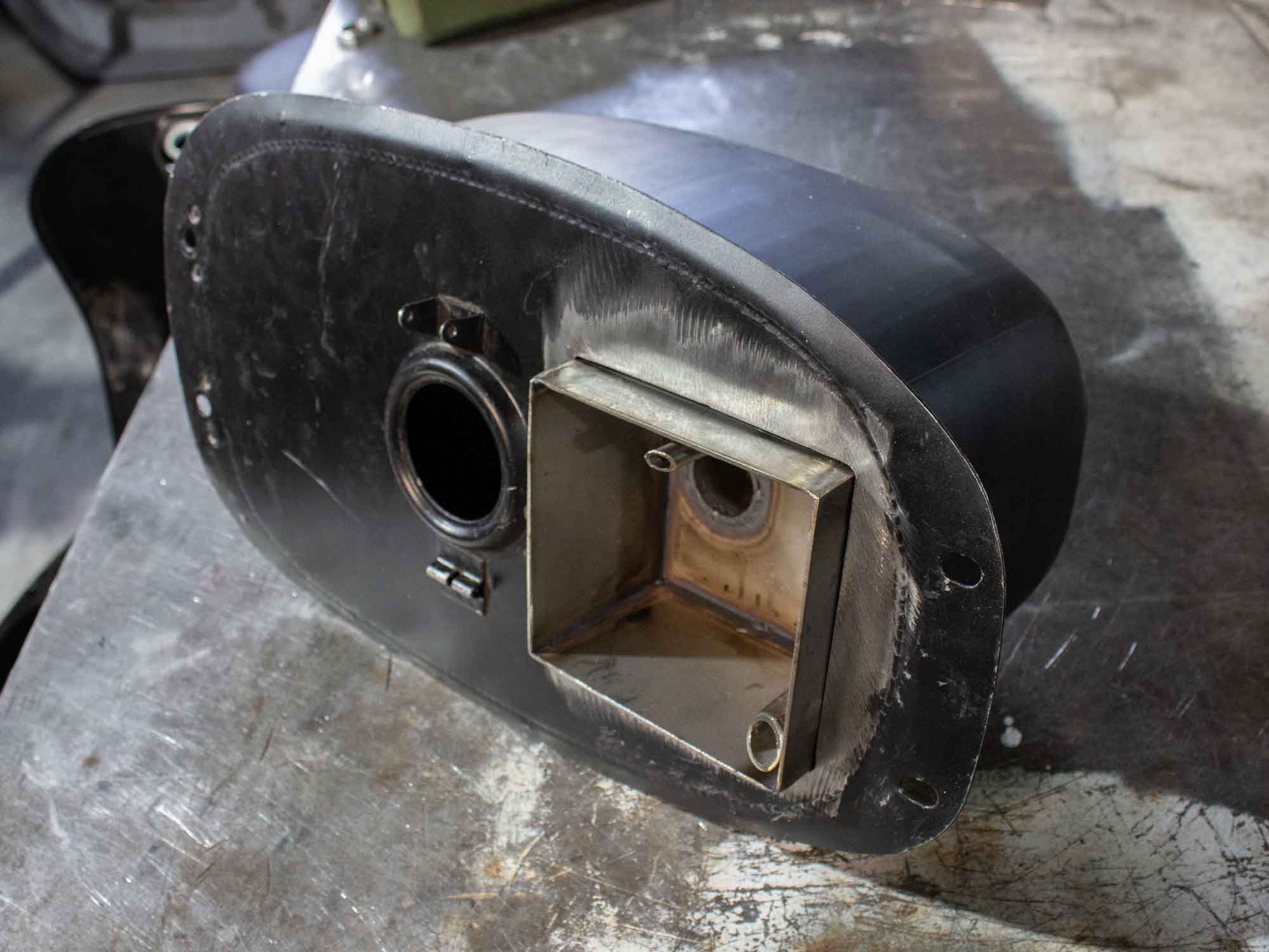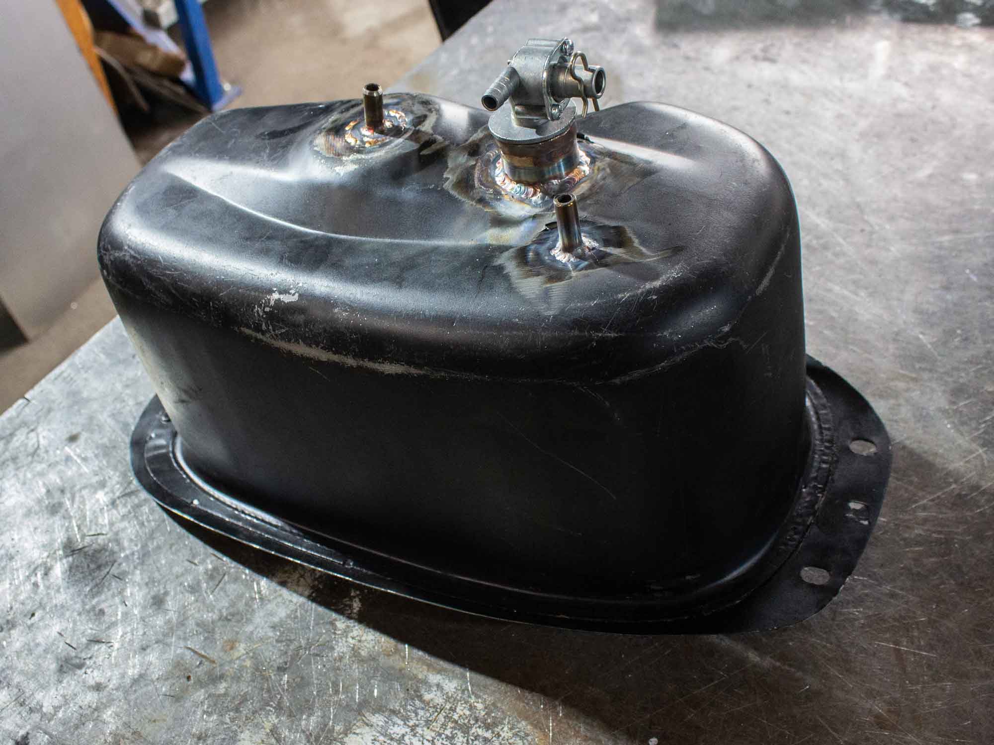 Die Grundlage für diese Konstruktion bildet ein Vespa Largeframe Tank mit Bügelverschluss, in den wir einen zweiten, etwa 0,8 Liter fassenden Zwischentank implementieren, der auf dem höchst-möglichen Niveau positioniert ist: