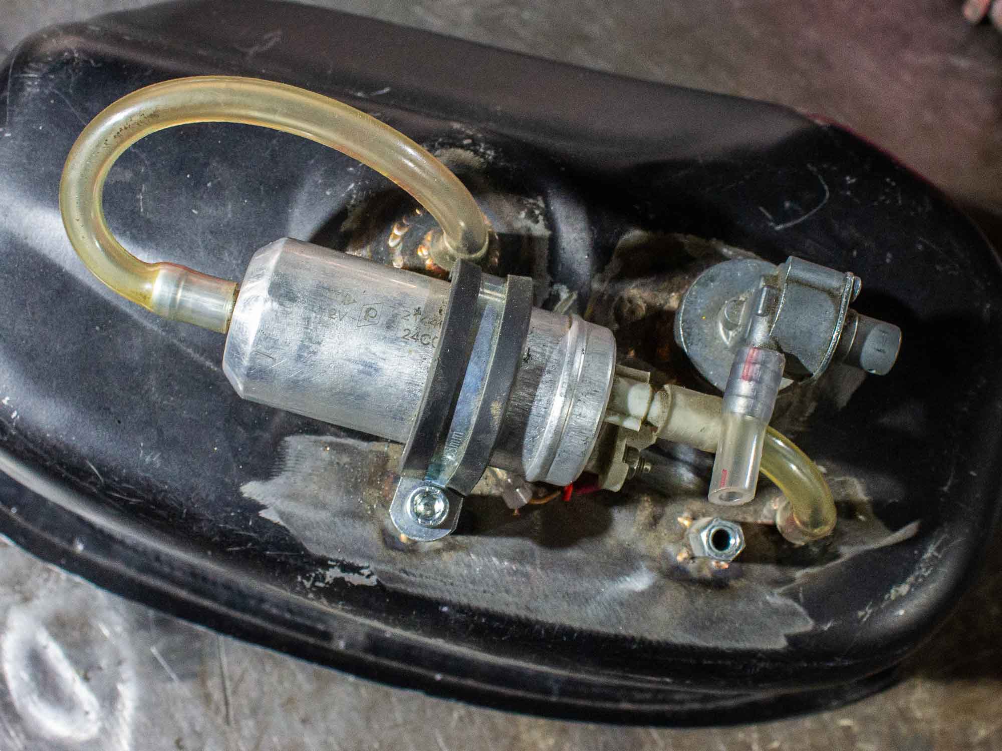 Die für diese Konstruktion benötigte Benzinpumpe fördert den Kraftstoff ständig vom Haupttank in den kleinen Tank, der an seinem höchsten Punkt einen Überlauf hat, der zurück in den Haupttank führt - der Benzinhahn bezieht den Kraftstoff aus dem immer vollständig gefüllten kleinen Zusatztank.