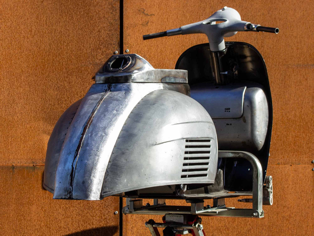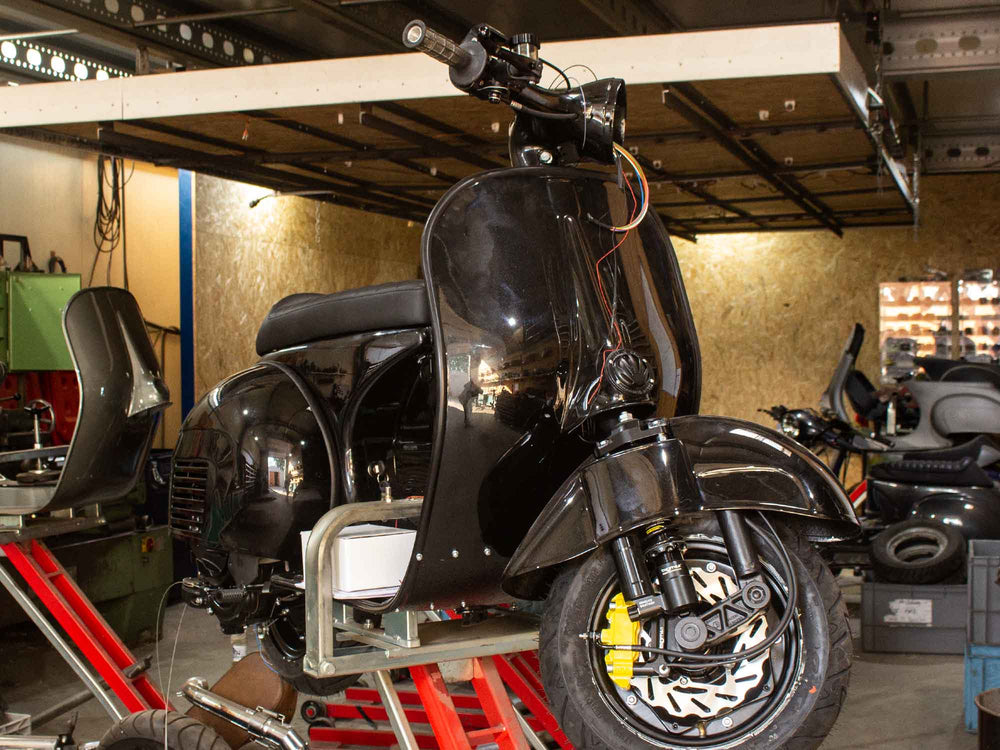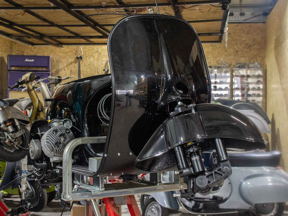 Custom Vespa Projekt mit GS 160-Heck und 125ccm Vespa T5 Motor - Lackierung Ferrari Nero Daytona Metallic.