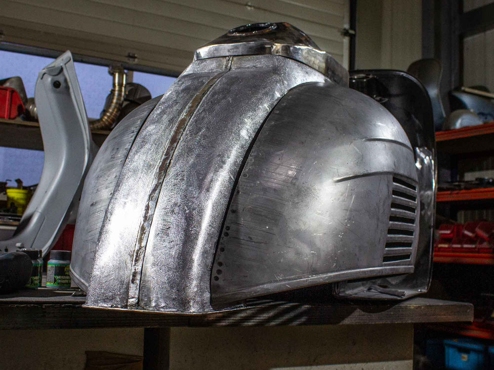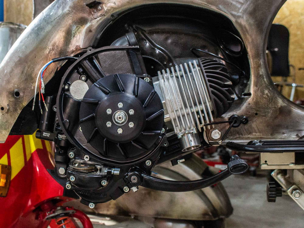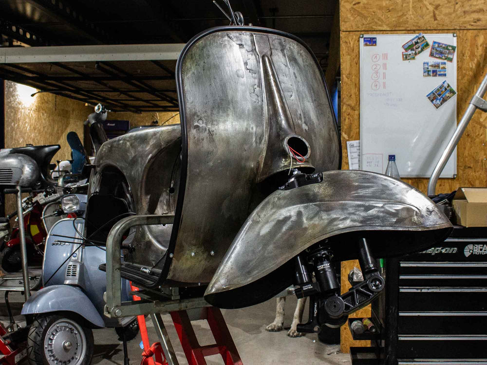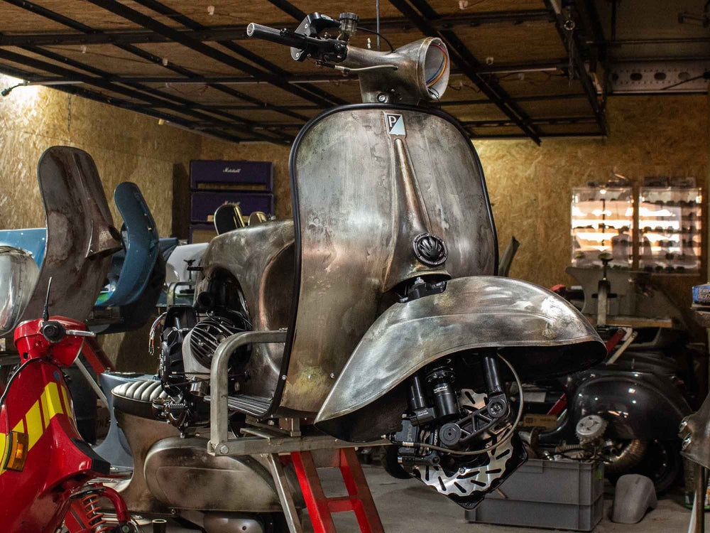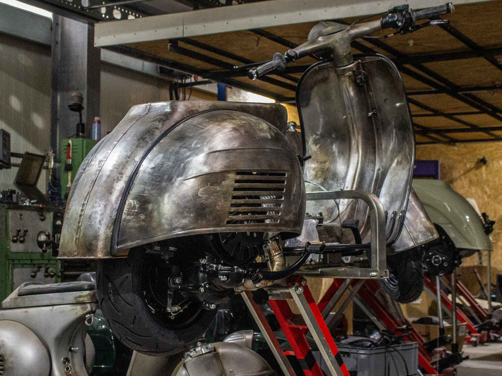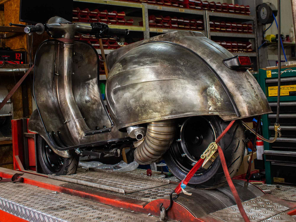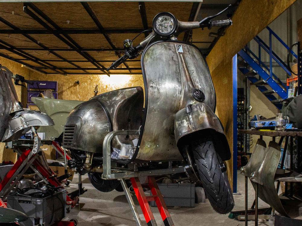 Custom Vespa Projekt mit 265ccm BFA Motor im Raw Metal Style.