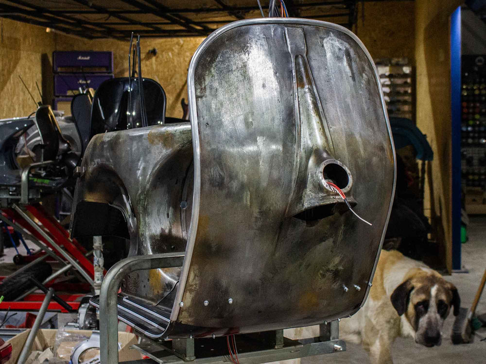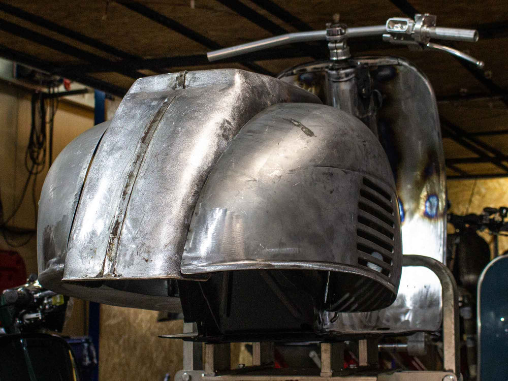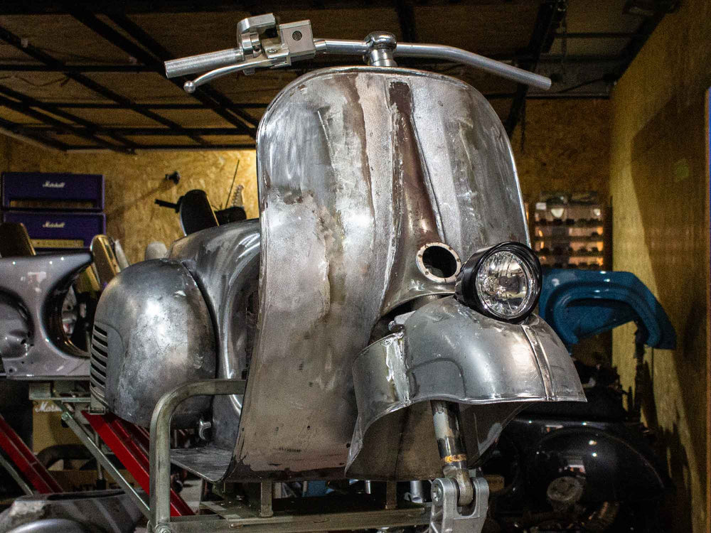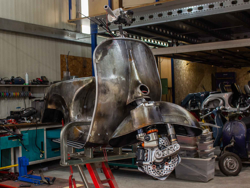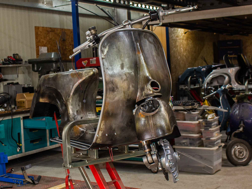 Vespa PX-VNB Conversion mit Drag Bar Lenker und 250ccm Quattrini Motor im Raw Metal Style.