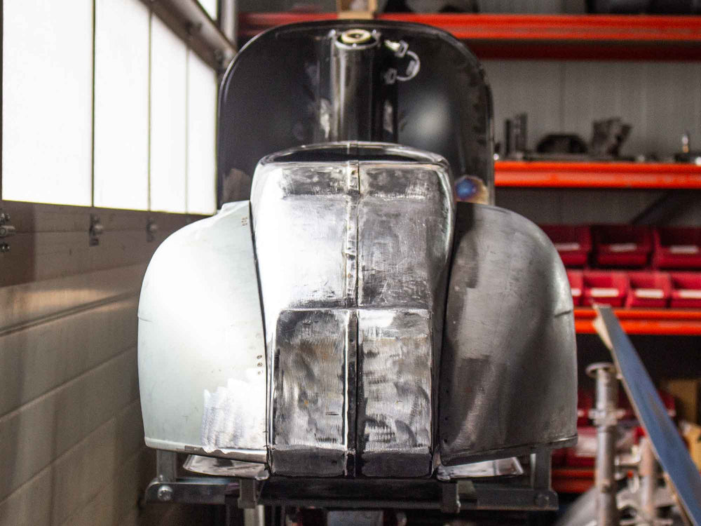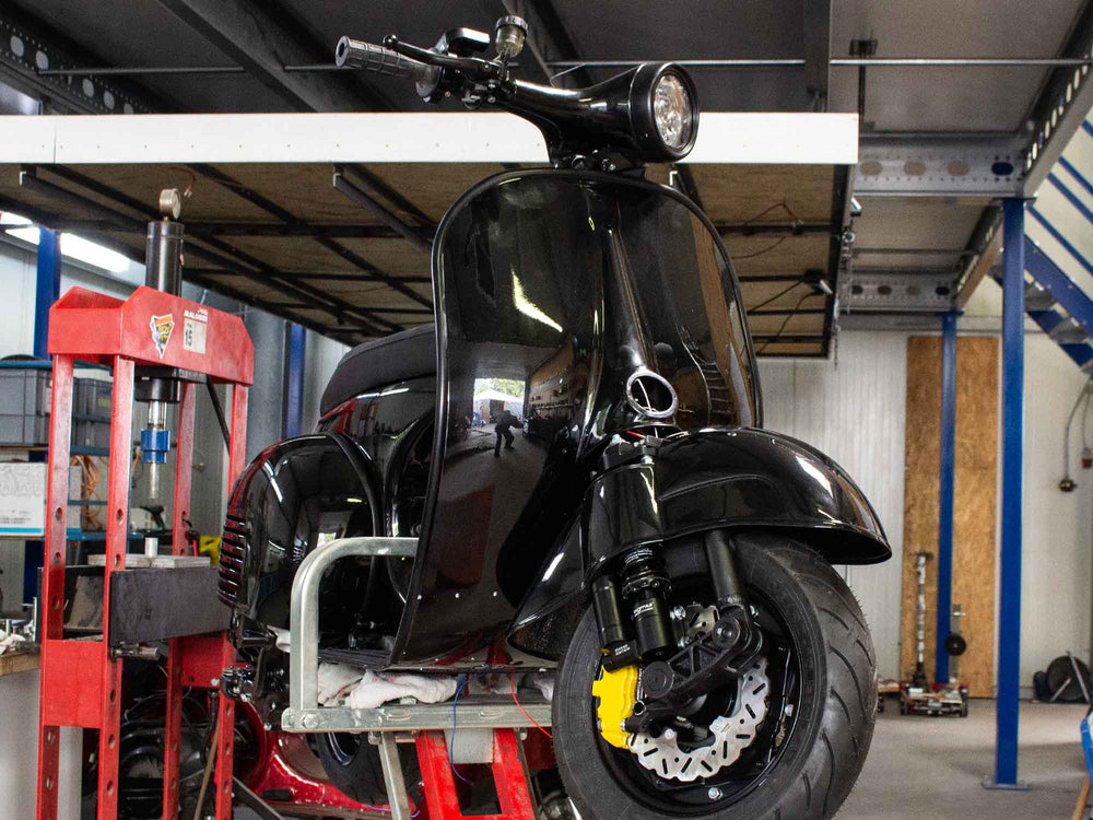 Custom Vespa Projekt aus unserer Superlow Series im VNB-Style - 244ccm Quattrini Motor, Lackierung Ferrari Nero Daytona Metallic.