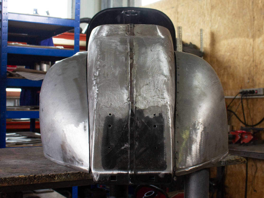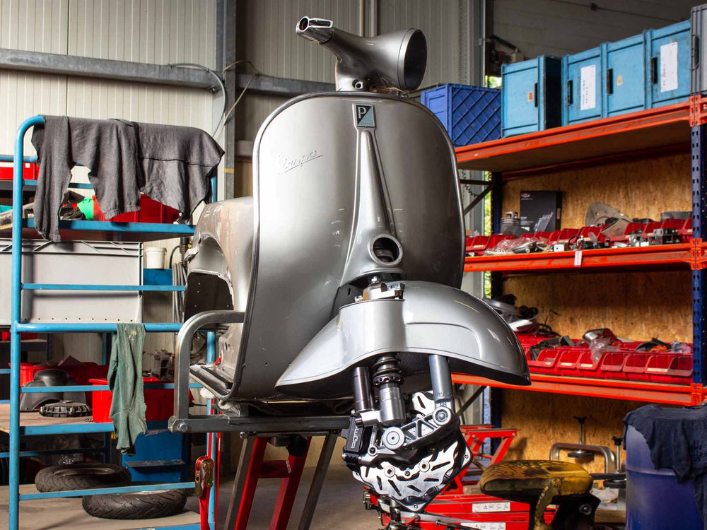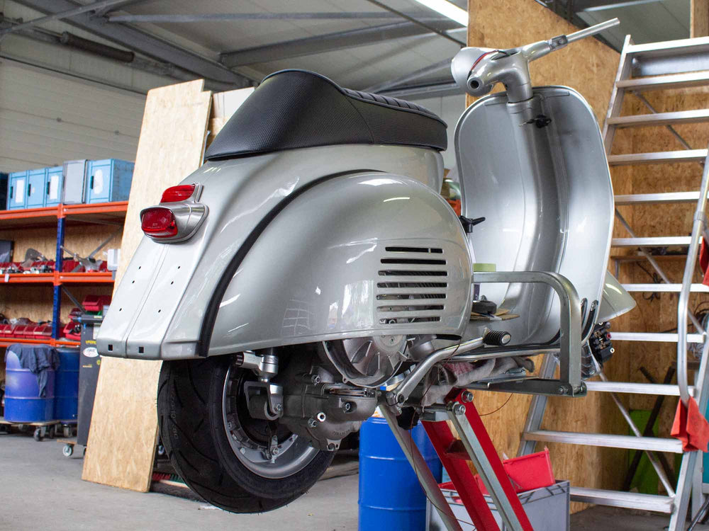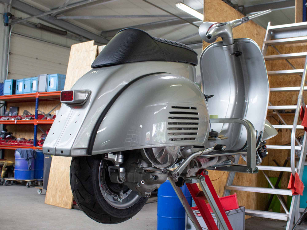 Custom Vespa Projekt im VNB-Classic Style mit Quattrini 244ccm Motor, Farbe Mercedes Silbergrau Metallic.